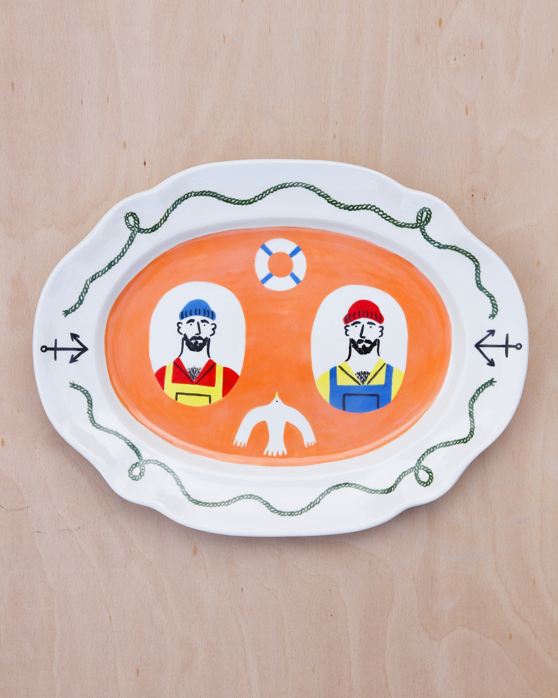 Special Friends? Roommates? This series of platters depicts two companions side by side, surrounded by items and motifs that evoke a sense of place. These platters are glazed earthenware, food safe but wipe clean only, never put in the dishwasher. Equally perfect as a decorative item displayed on a coffee table or hung on the wall. Measures approx 35x25cm.